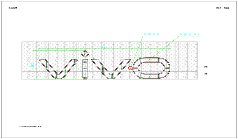 2,安装视角,通过绿色正方形图示清晰的标注vivo大字骨架需要配合安装的预埋点,从深化图纸可以看出,一共29个,取消了大字“o”左侧的一个多余预埋点。同时明确了大字骨架对应预埋点在建筑物楼体的详细位置与尺寸,深化图上面是7楼和8楼的中间位置,略偏向8楼。